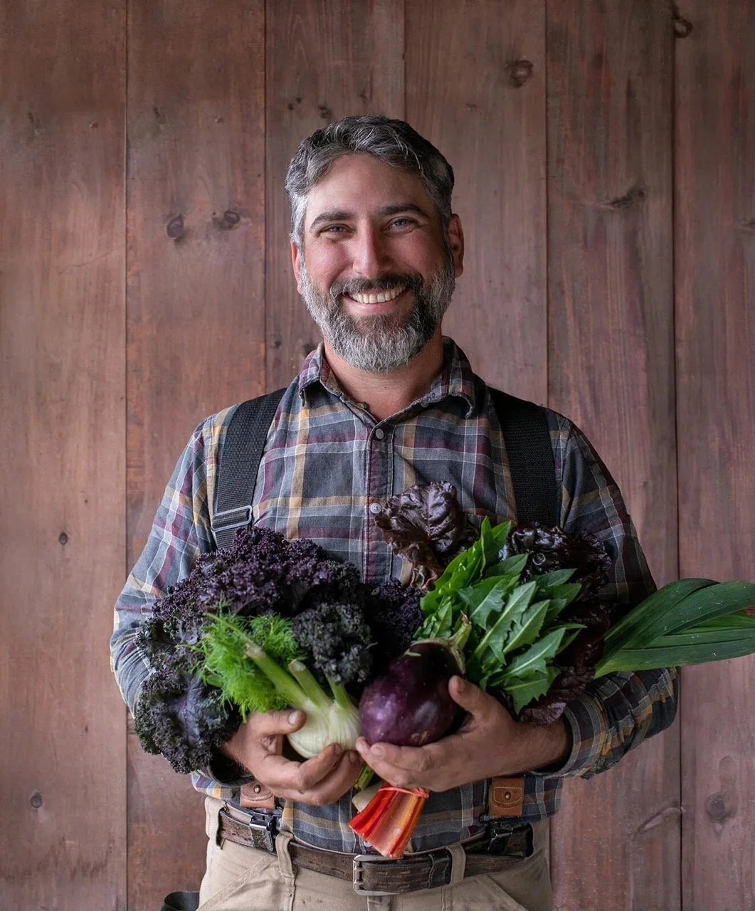 • The image is a headshot of Jarret Nelson wearing a patterned button-down  and brown pants while holding an armful of produce in front of a wood paneled background.