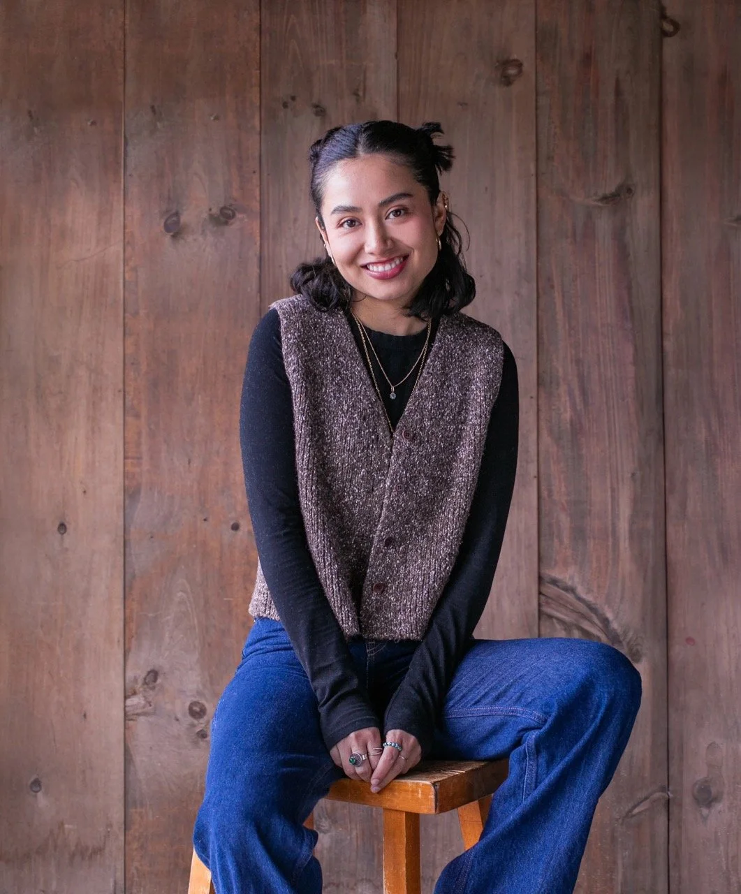 • The image is a headshot of Anabel Mejia wearing a brown sweater vest over a black shirt and blue jeans in front of a wood paneled background.