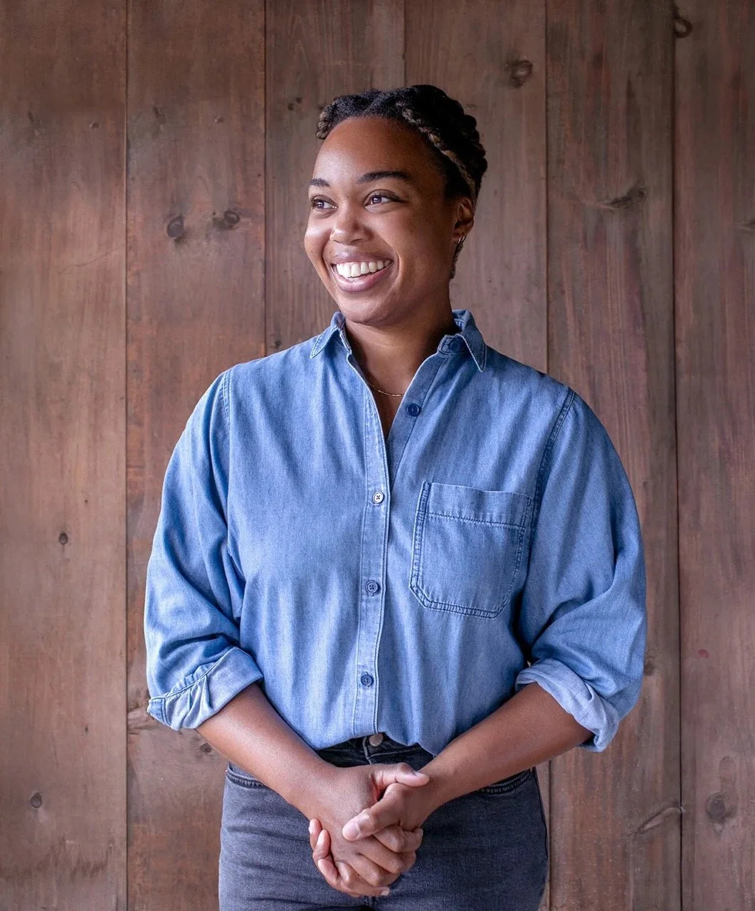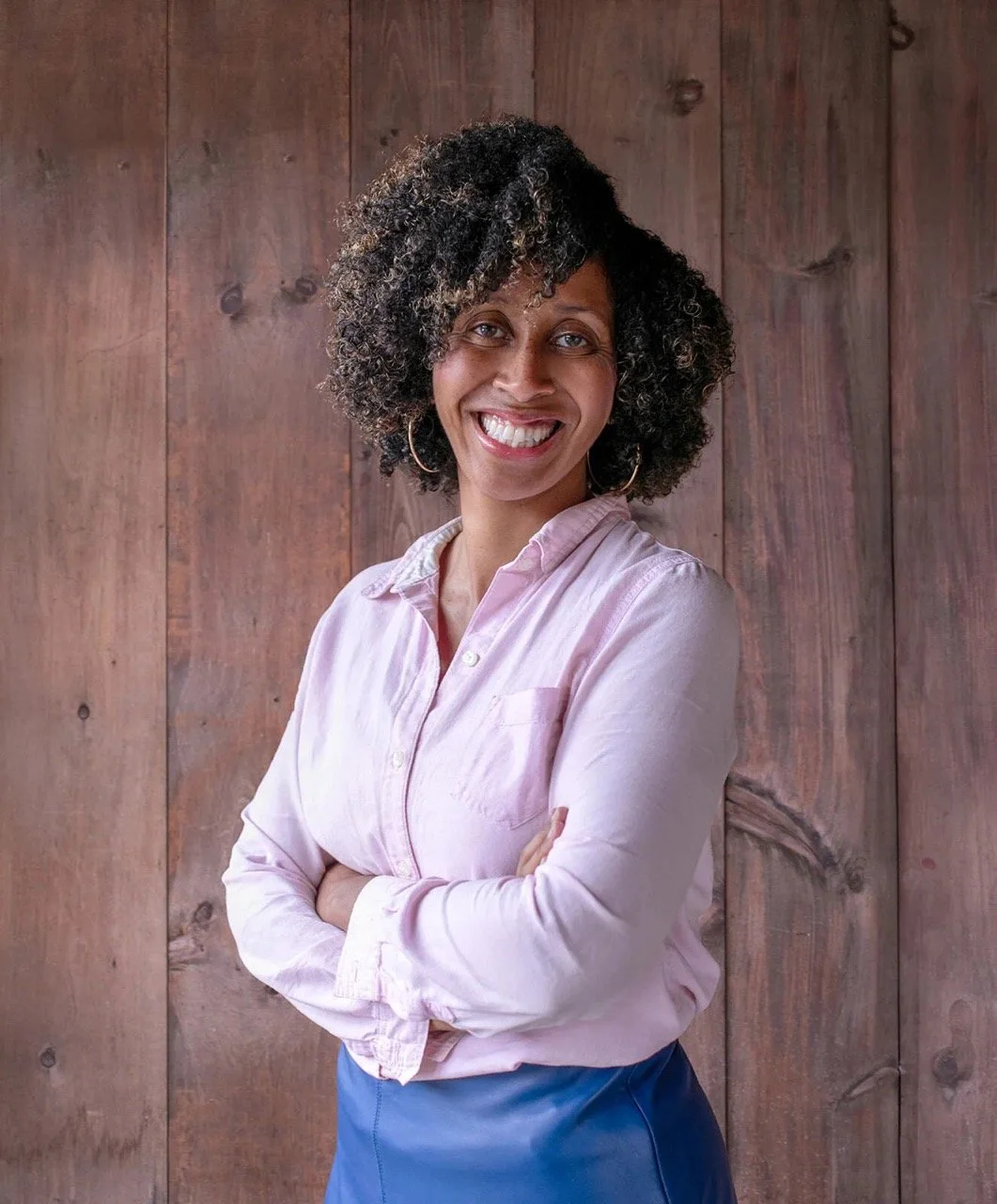 • The image is a headshot of Nicole Scott wearing a blue button-down and grey pants in front of a wood paneled background.