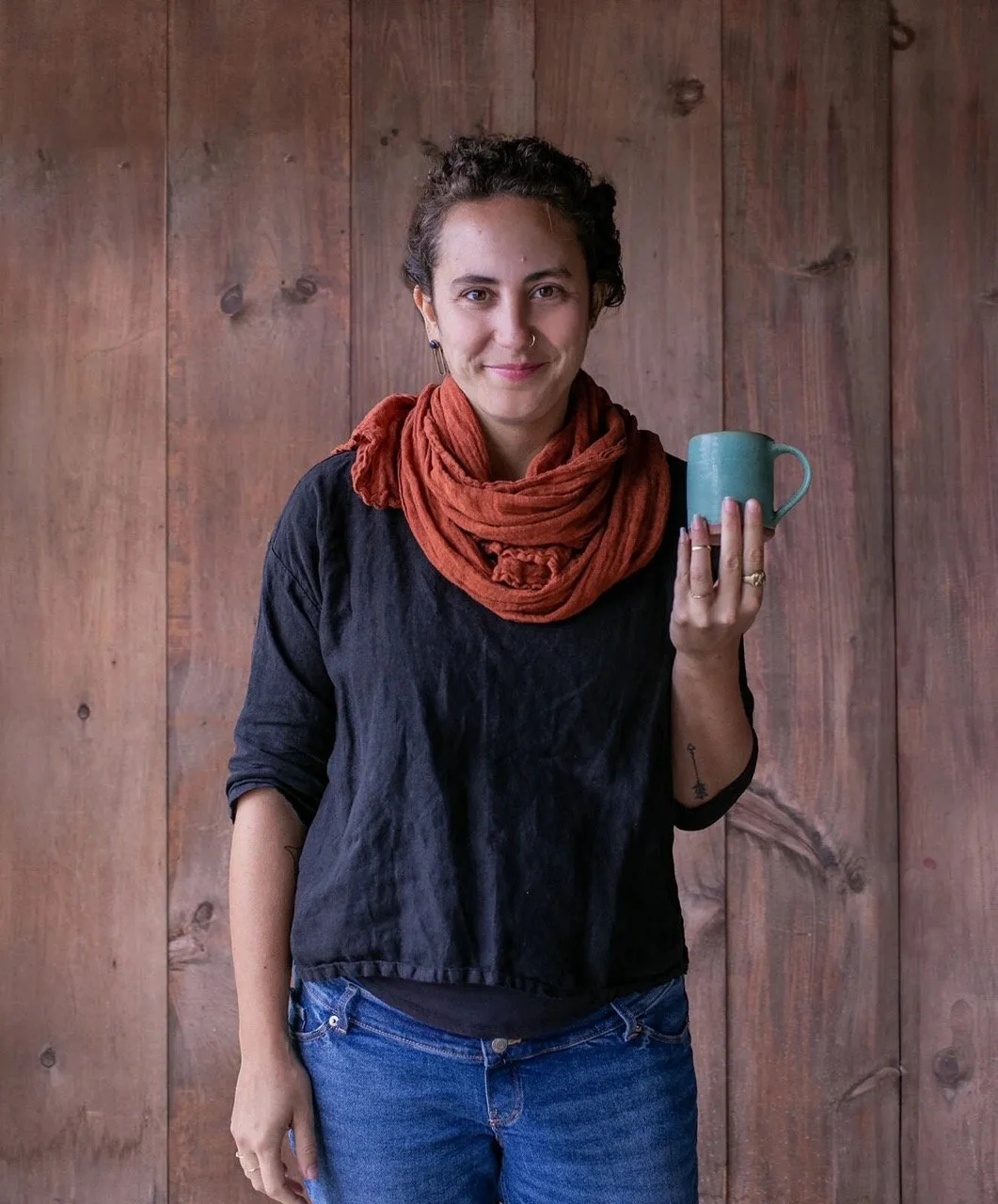 • The image is a headshot of Suzy Konecky wearing a black shirt, orange scarf, and blue jeans while holding a turquoise mugin front of a wood paneled background.