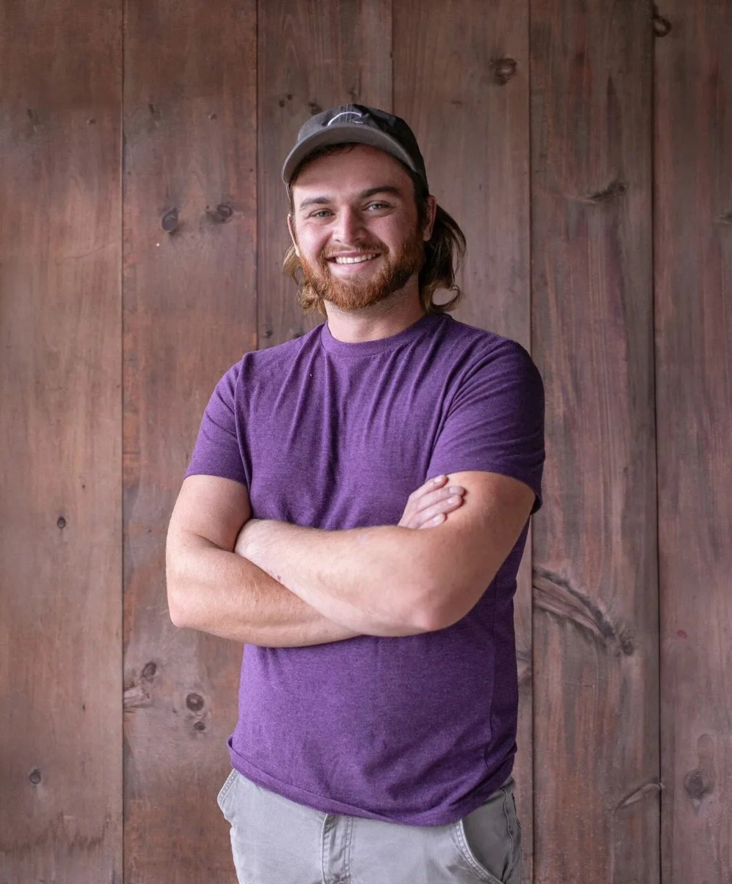 • The image is a headshot of Brian Kissane wearing a purple t-shirt and grey pants in front of a wood paneled background.