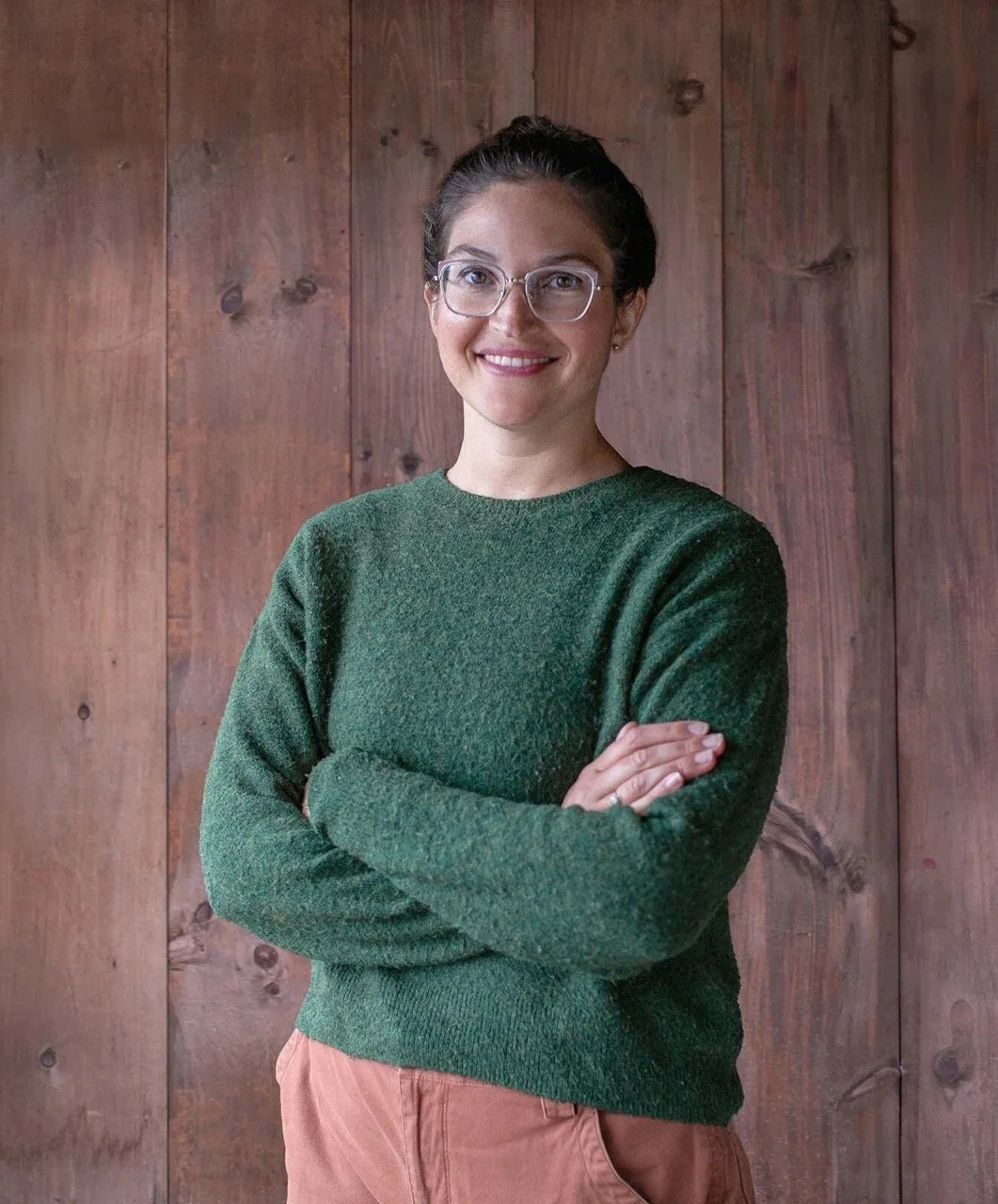 • The image is a headshot of Chelsea Anan wearing a green top and brown pants in front of a wood paneled background.