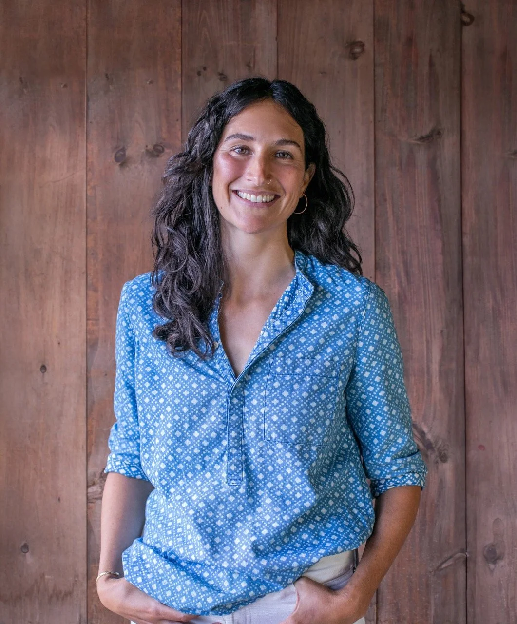 • The image is a headshot of Claire Briguglio wearing a blue top and white pants in front of a wood paneled background.