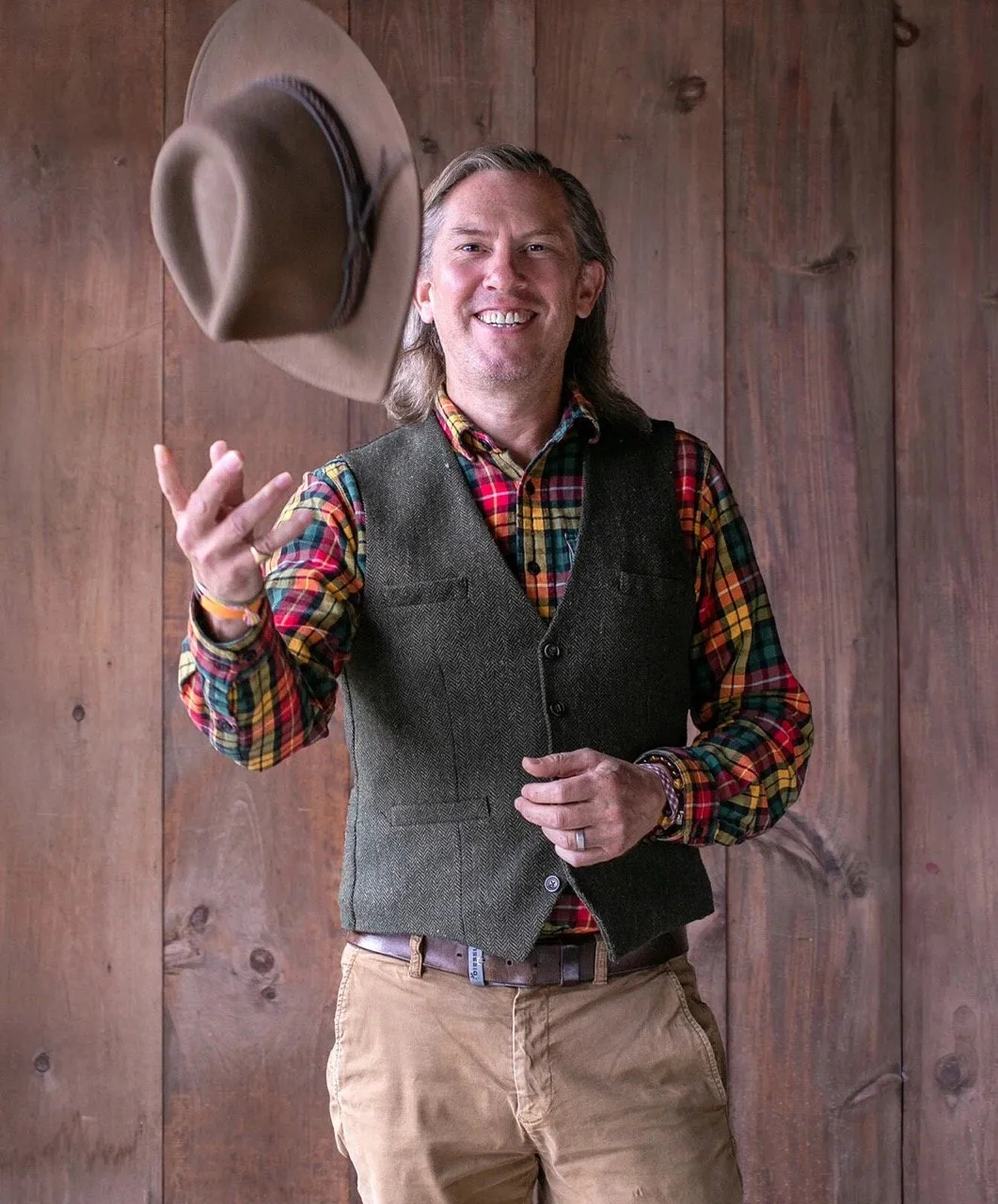 • The image is a headshot of Mark Daisley throwing a hat into the air and wearing a vest over a colorful button up and brown pants in front of a wood paneled background.