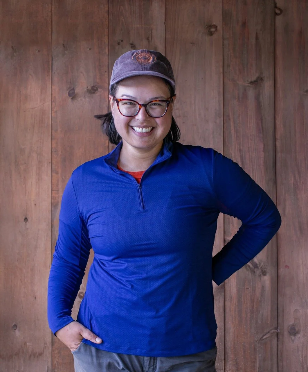 • The image is a headshot of Miya Kumangai wearing a blue shirt, purple cap, and blue pants in front of a wood paneled background.