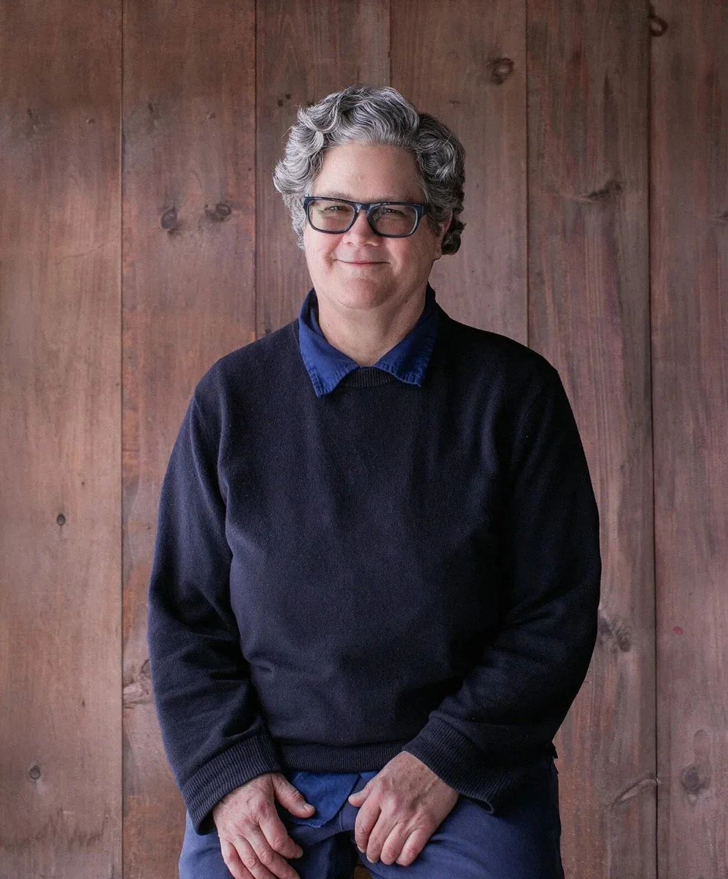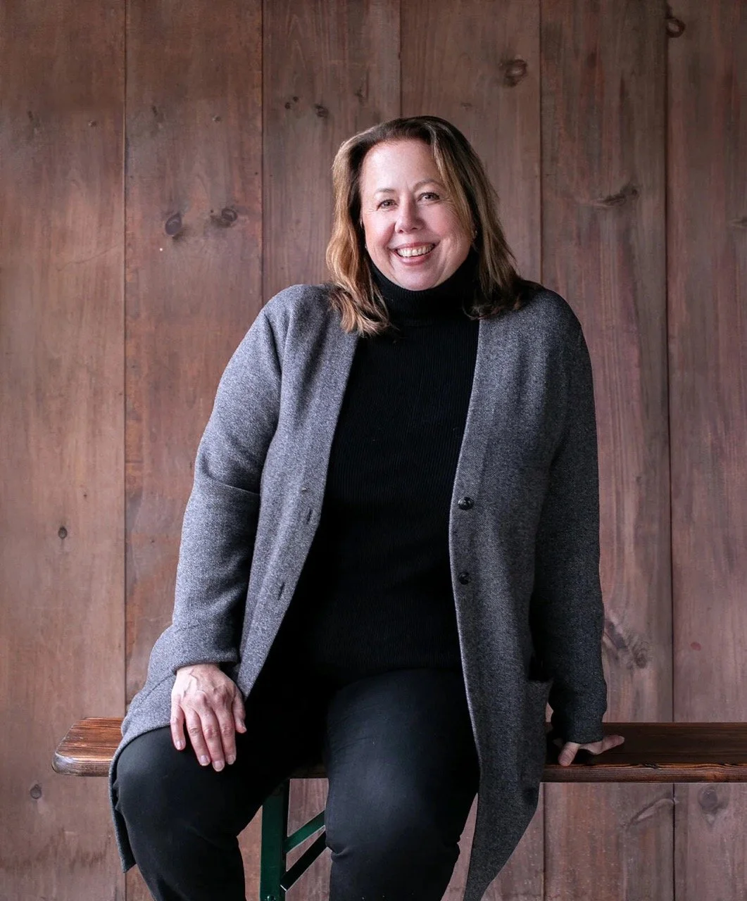 • The image is a headshot of Kim Vargo wearing a grey sweater over a black shirt and black pants in front of a wood paneled background.