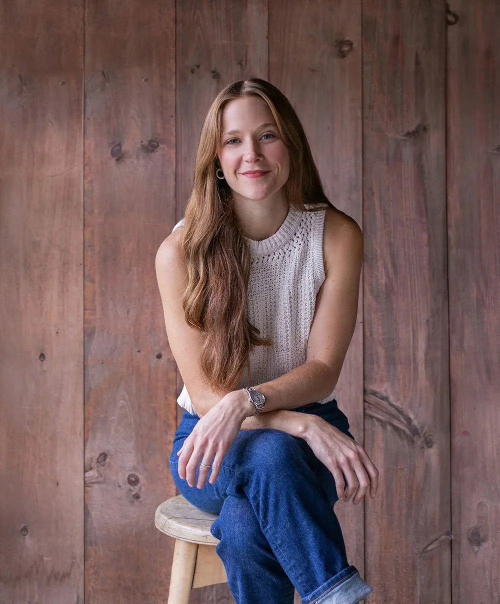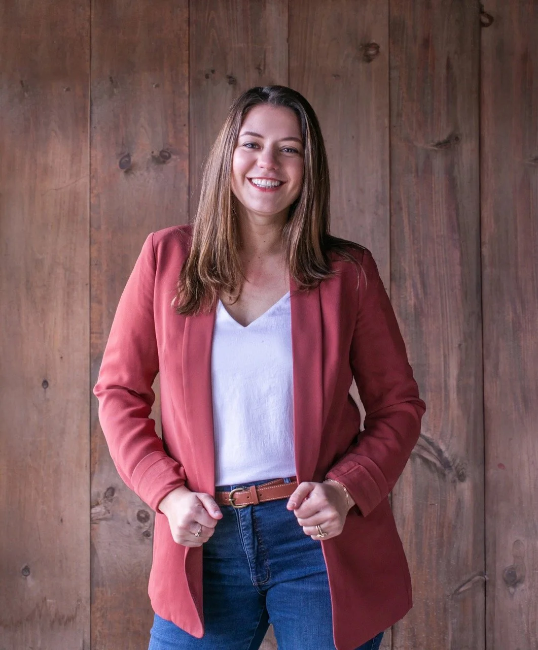 • The image is a headshot of Lindsey Andes wearing a white top and blue jeans in front of a wood paneled background.
