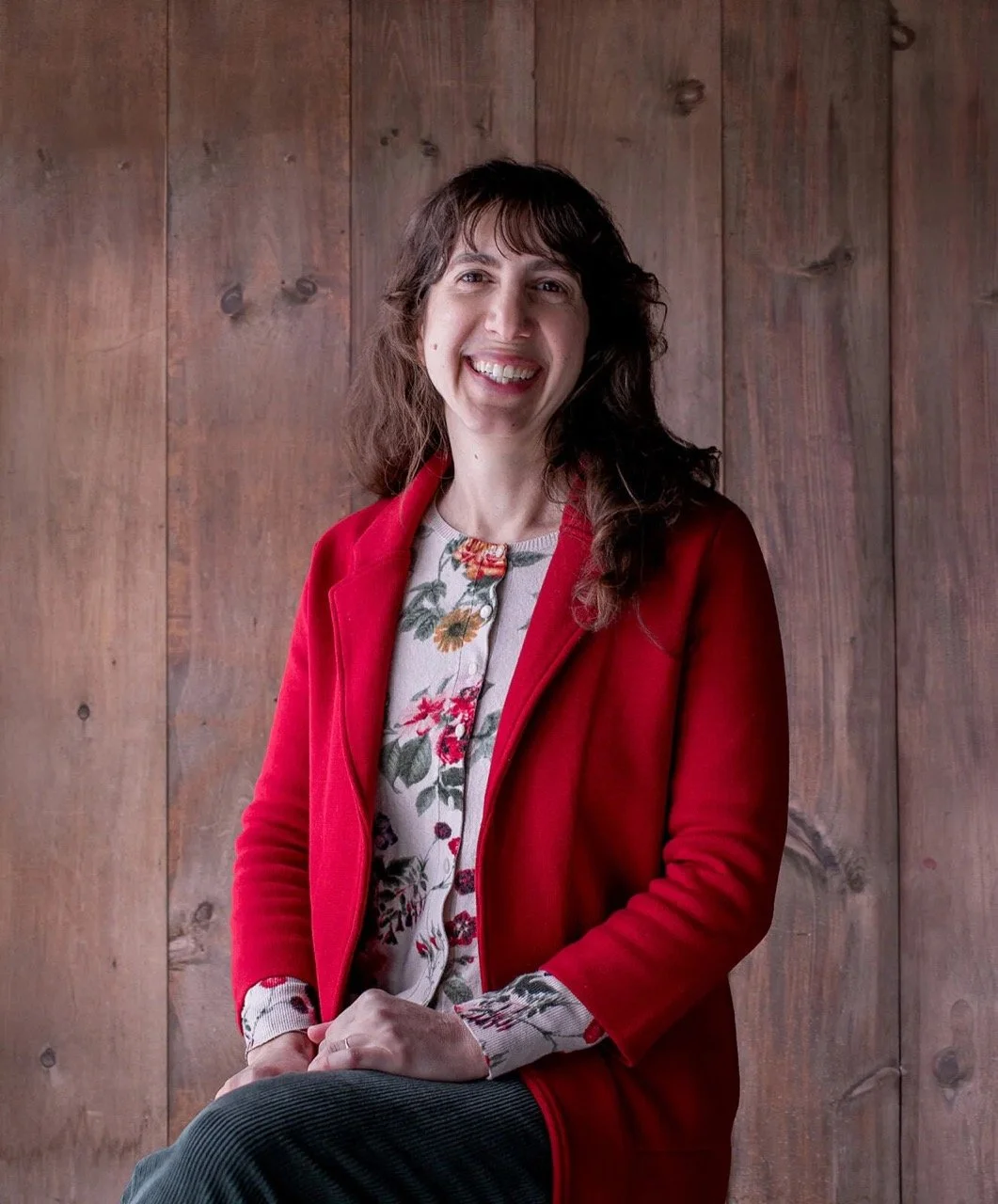 • The image is a headshot of Jenn Hayden wearing a red sweater over a flowered top and grey pants in front of a wood paneled background.