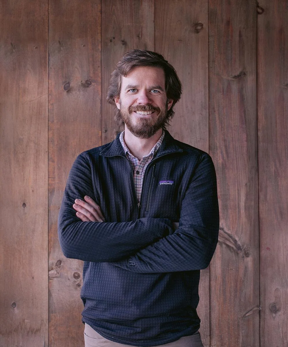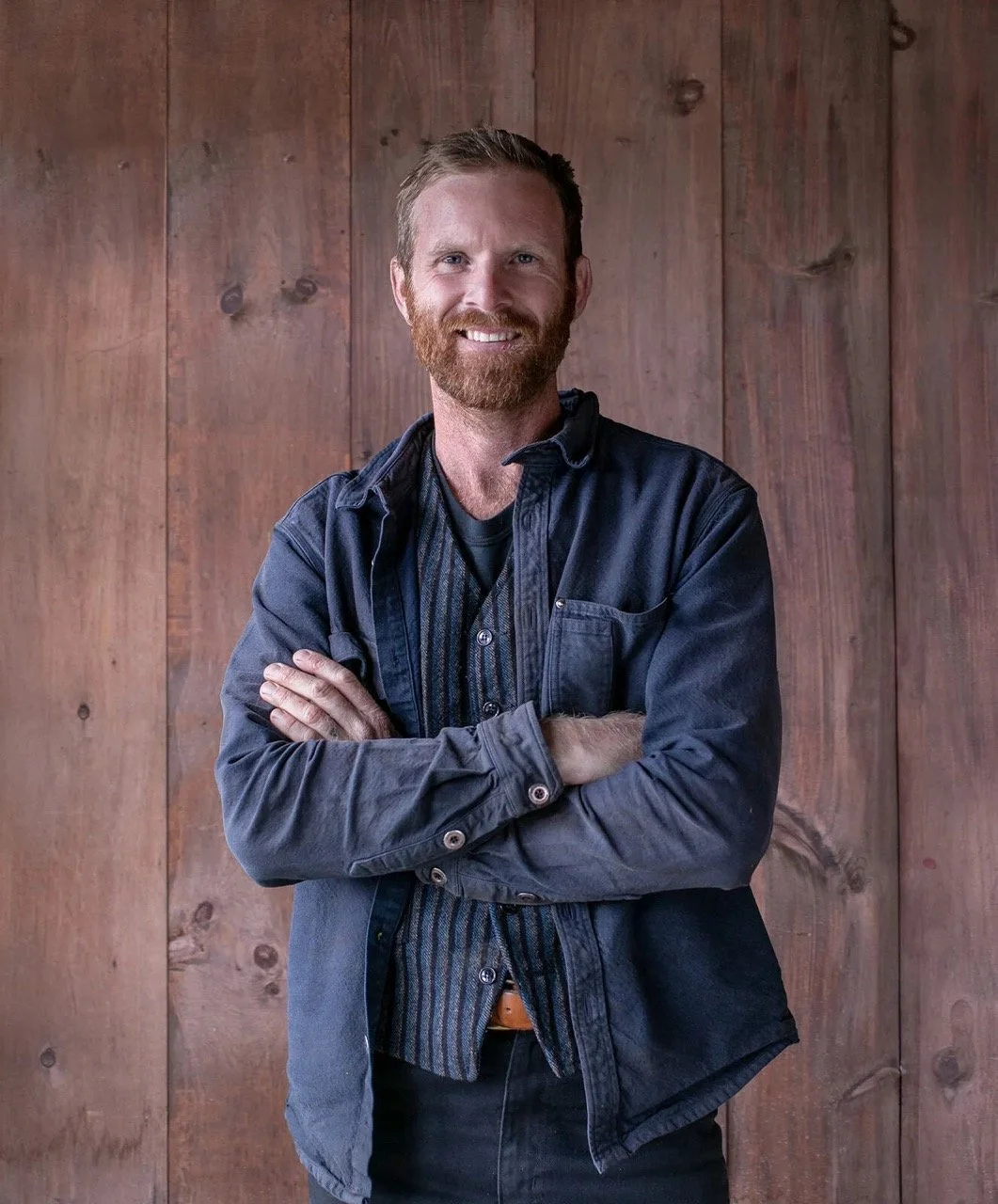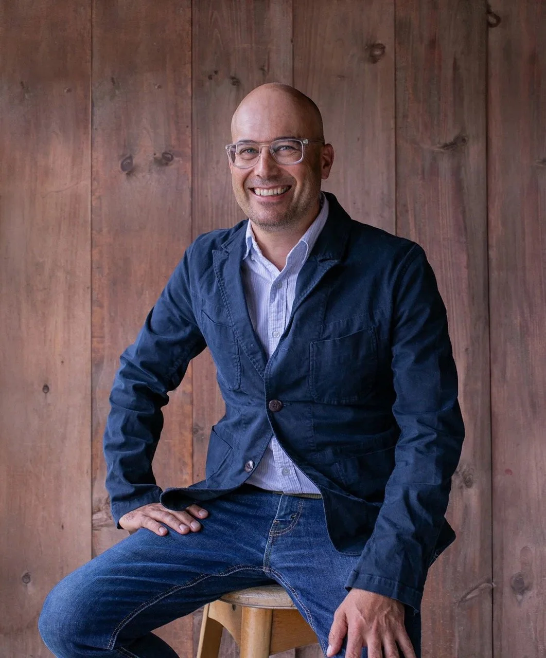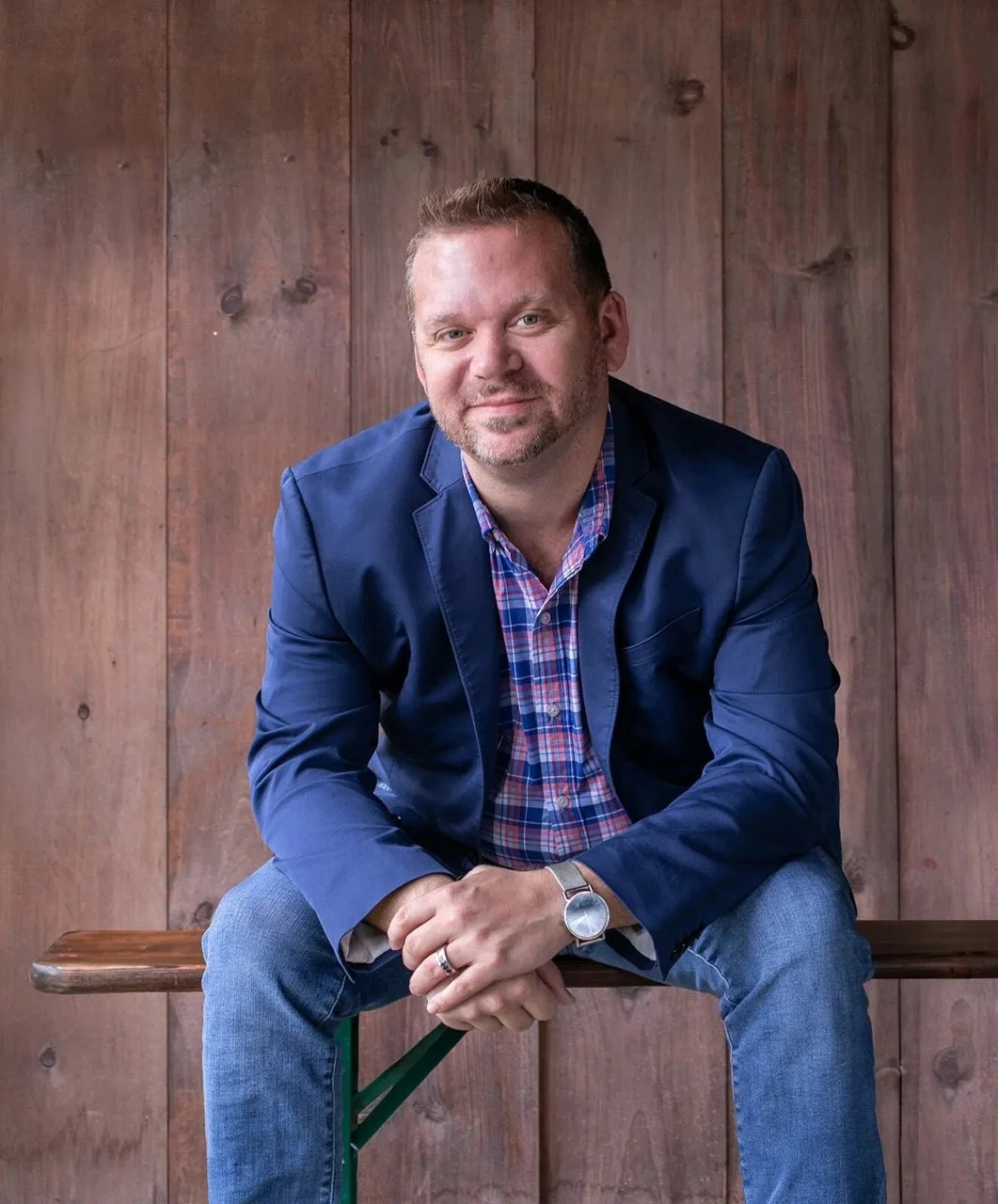 • The image is a headshot of Ryan Cincanelli wearing a blue jacket over a colorful button up and blue jeans in front of a wood paneled background.