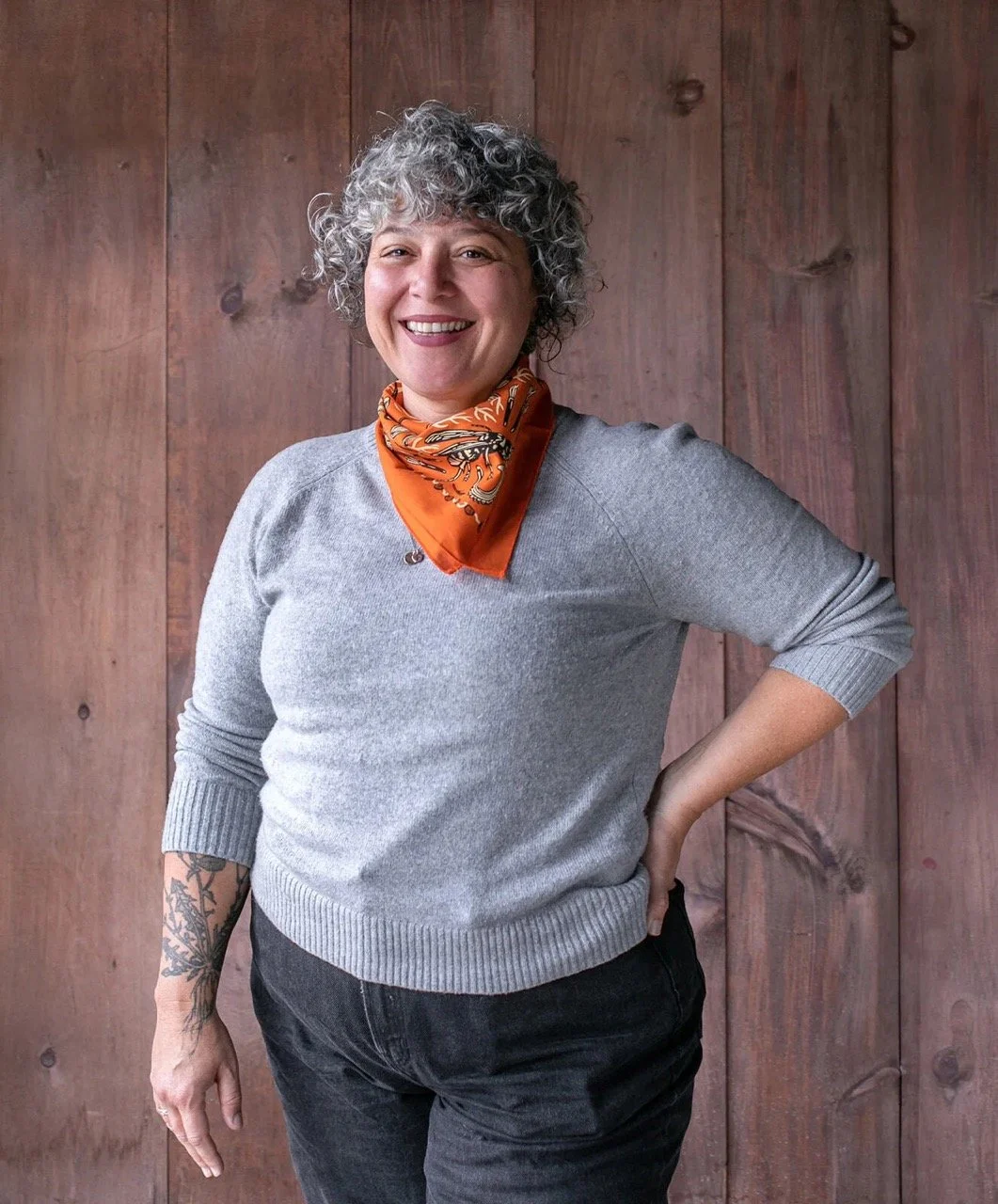 • The image is a headshot of Megan Larner wearing a grey sweater, orange scarf, and grey pants in front of a wood paneled background.