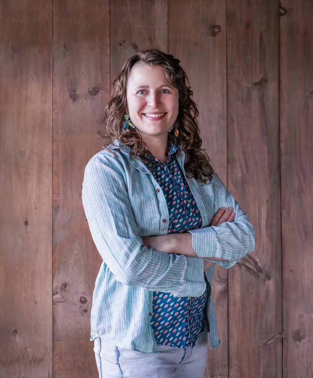 • The image is a headshot of Kate Anstreicher wearing a scarf and a blue top and pants in front of a wood paneled background.