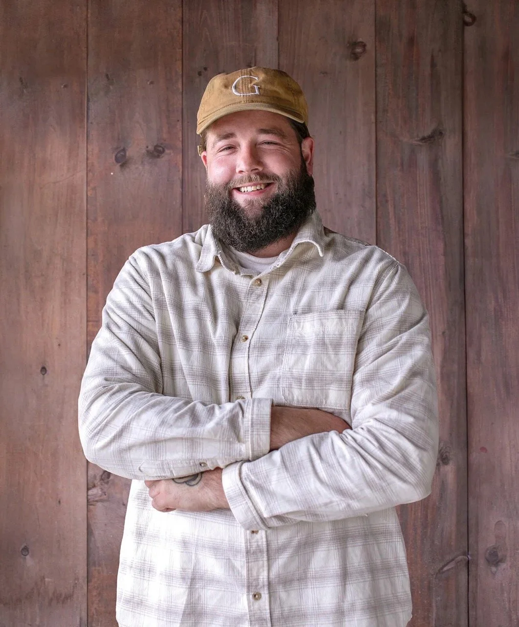 • The image is a headshot of Chris Jennings wearing a beige button up and brown cap in front of a wood paneled background.