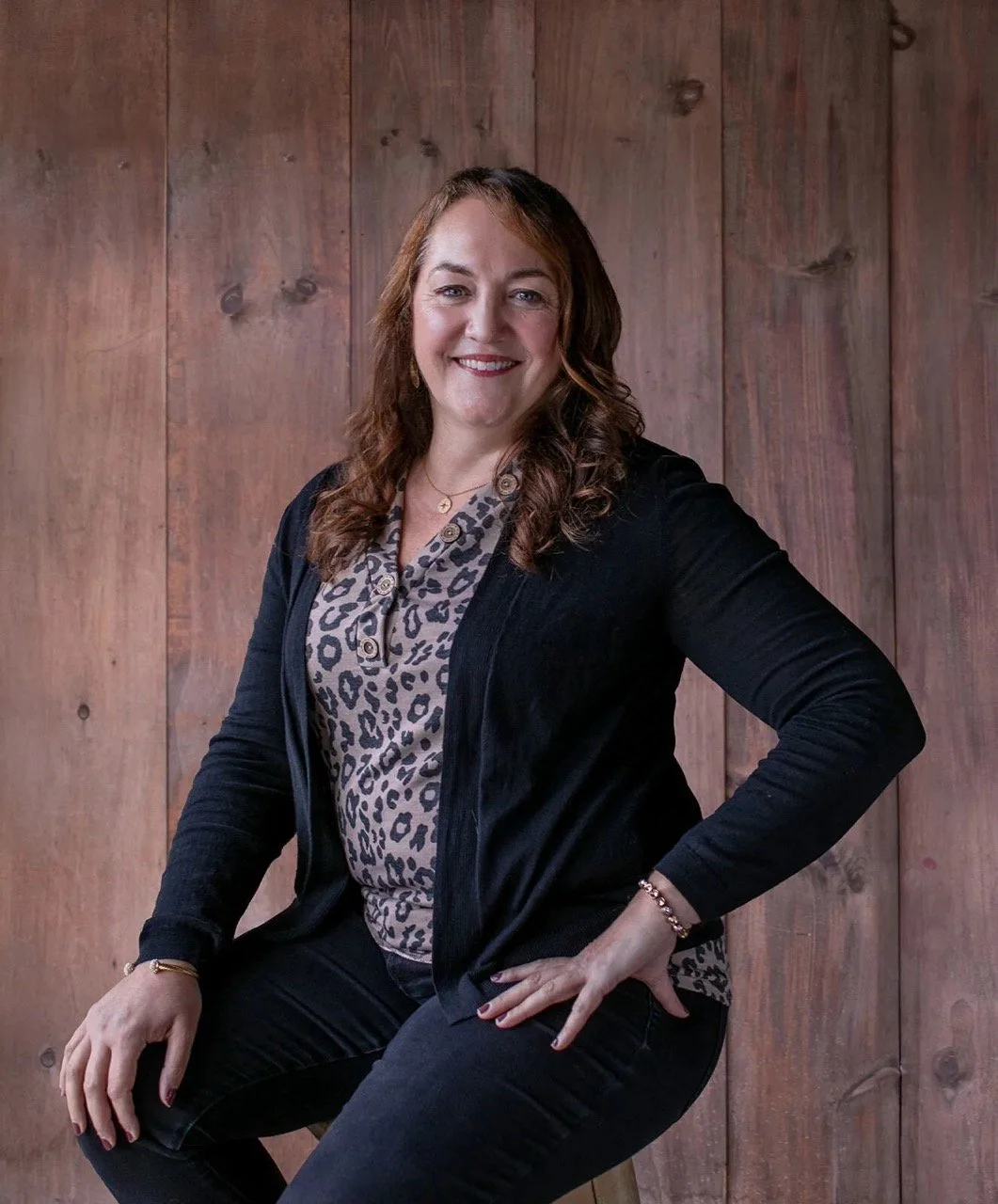 • The image is a headshot of Carmela Frattelone wearing a black sweater over a leopard print top and black pants in front of a wood paneled background.