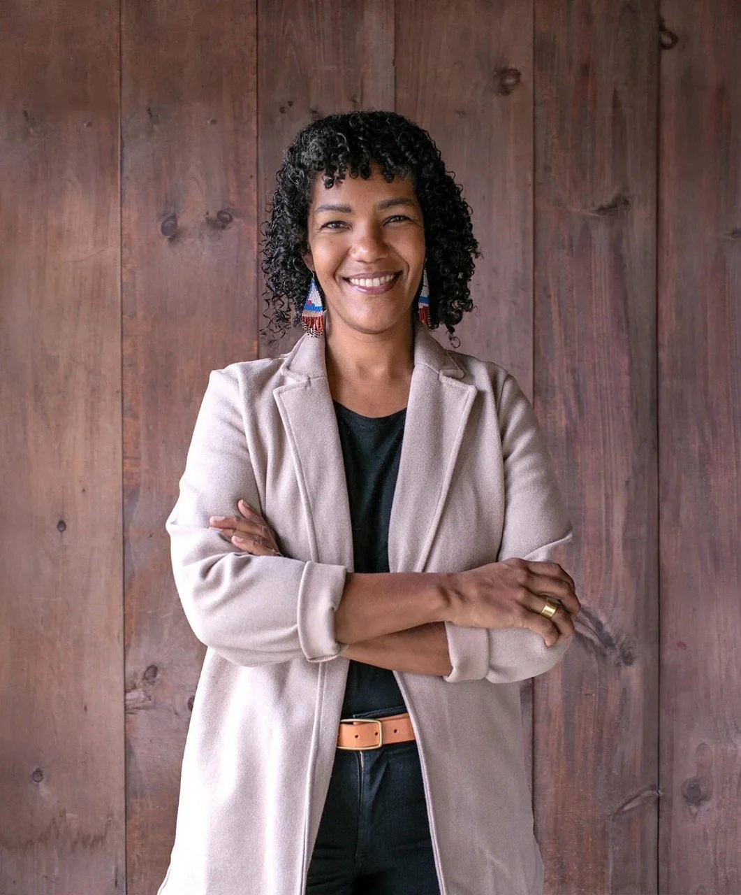 • The image is a headshot of Michelle Hughes wearing a cream jacket over a black top and black pants in front of a wood paneled background.