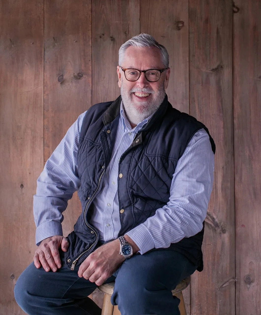 • The image is a headshot of Michael Smith wearing a black vest over a blue button-down and blue pants in front of a wood paneled background.