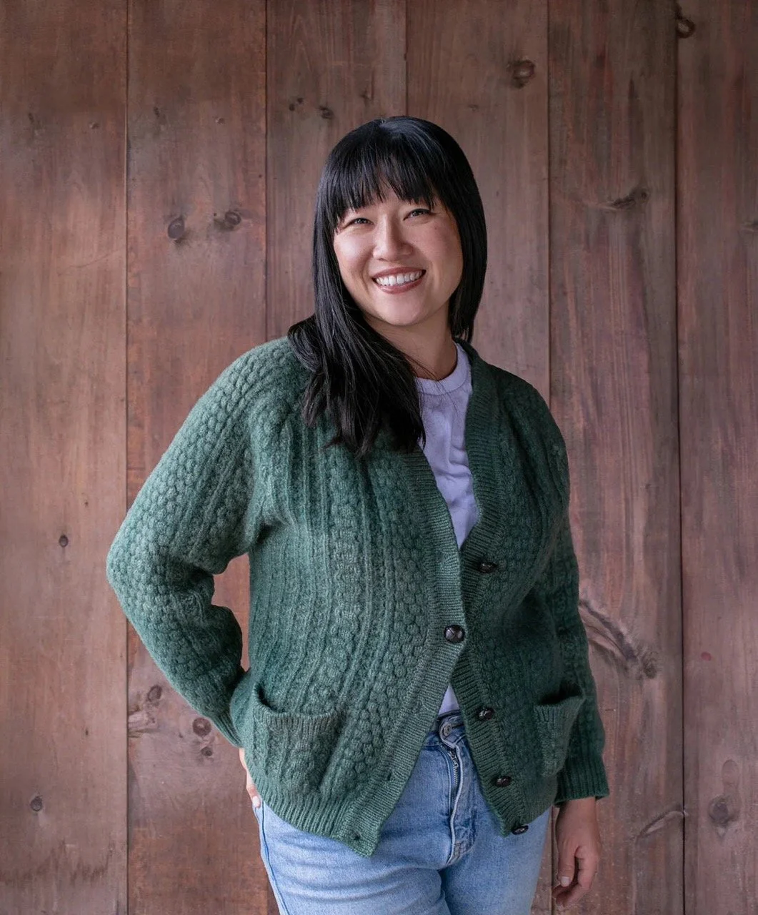 • The image is a headshot of Christina Chan wearing a green sweater and blue jeans in front of a wood paneled background.