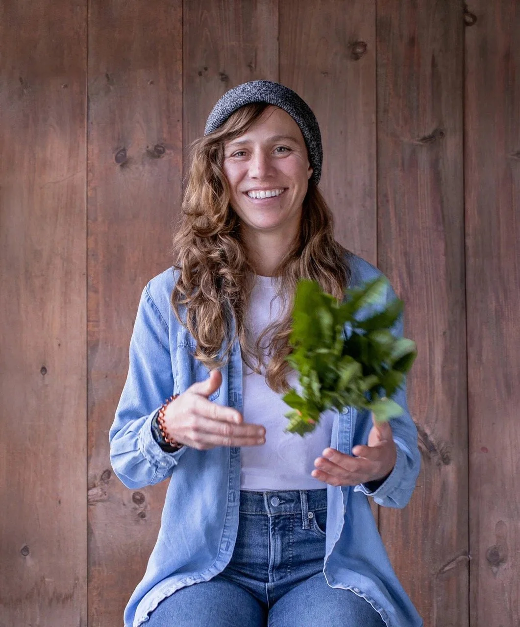 • The image is a headshot of Maddie Morley wearing a blue button-down over a white shirta nd blue jeans while throwing some green produce in the air in front of a wood paneled background.