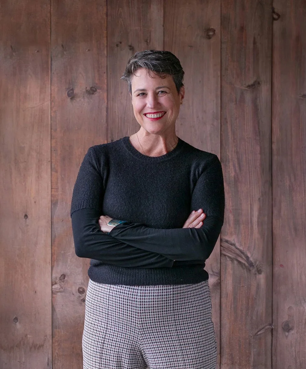 • The image is a headshot of Kathleen Finlay wearing a black top and grey pants in front of a wood paneled background.